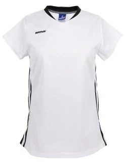 - Cap sleeve jersey with contrast color three stripe side inserts with main body color stripe toward front side of inserts – inserts end at angle under armholes